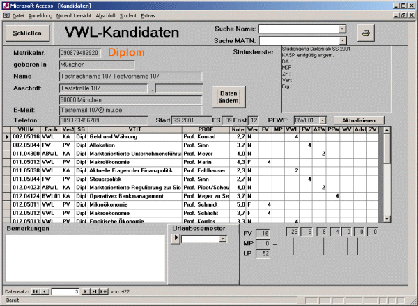 Zuletzt kann die Einteilung zur mündlichen Prüfung taggenau automatisch berechnet und danach umgestellt werden. Auch entsprechende Bescheinigungen und Zeugnisse über den Studienverlauf werden direkt aus der Datenbank erstellt.
